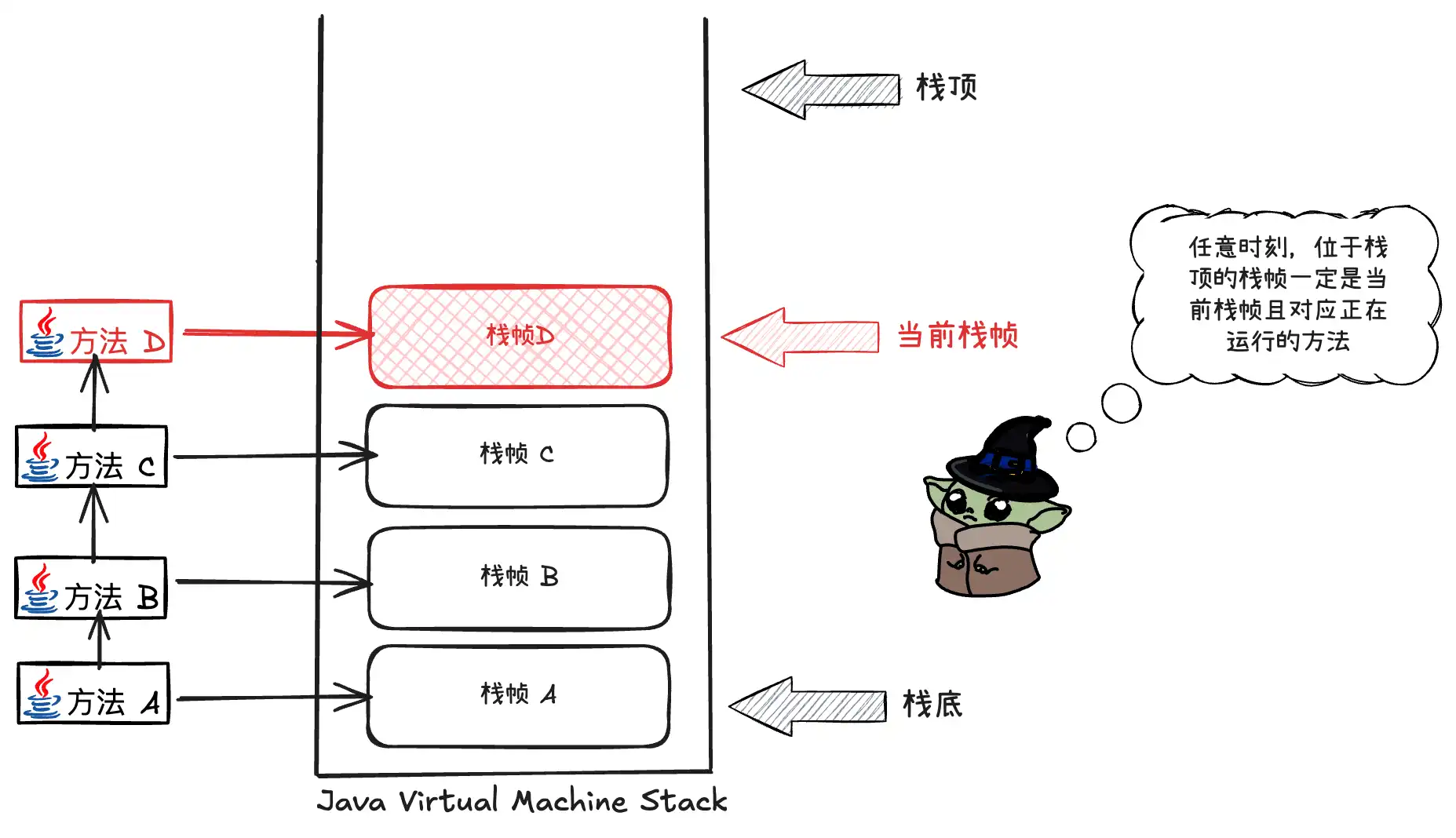 虚拟机栈遵循 后进先出(LIFO)原则。 在任意时刻, 一条活动的线程中只有一个活动的栈帧(当前栈帧), 对应 当前正在执行的方法。 执行引擎的所有字节码指令都只针对当前栈帧进行操作。