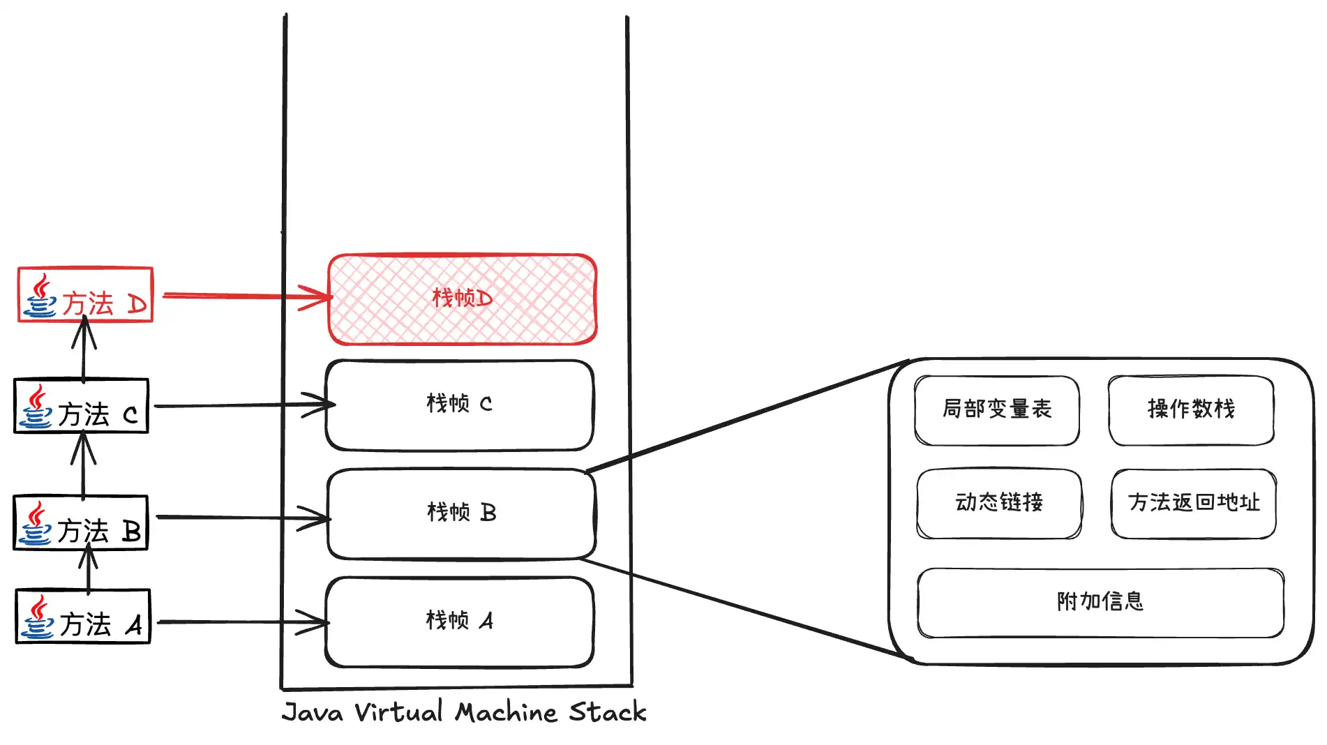 Java 虚拟机栈(Java Virtue Machine Stack,早期也称为 Java 栈)是 线程私有 的内存区域。每个线程在创建时都会分配一个独立的虚拟机栈,生命周期和线程完全一致。栈内部由一系列 栈帧(Stack Frame) 组成,每个栈帧对应一次 Java 方法调用。